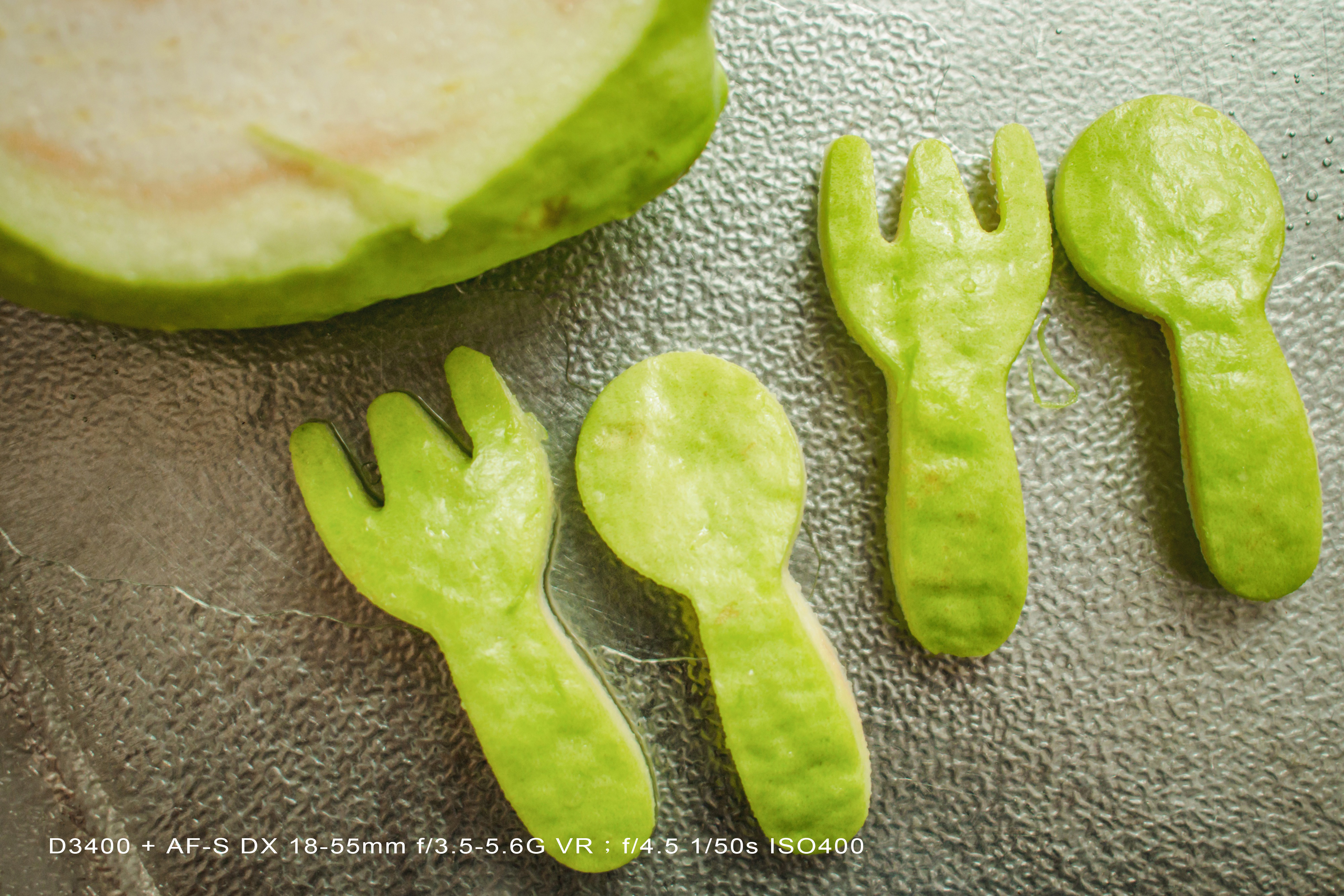 插個話,以前對單眼相機的認知就是,若不是專業攝影能手,要拍出畫質優異的好照片,都是要萬中選一的,往往拍了好幾百甚至好幾千張,才能選出幾張滿意的,有時候還有選不出來的悲劇。但D3400的模式設定很好相處很有親和力,清楚簡單好操作,拍攝功能選項中有分簡易與進階,皆有圖文說明,連小朋友都會用;而且畫質很棒,取好角度按下快門,拍攝的失敗率很低。這張芭樂美照,是在家裡的廚房拍攝,只拍一張。
