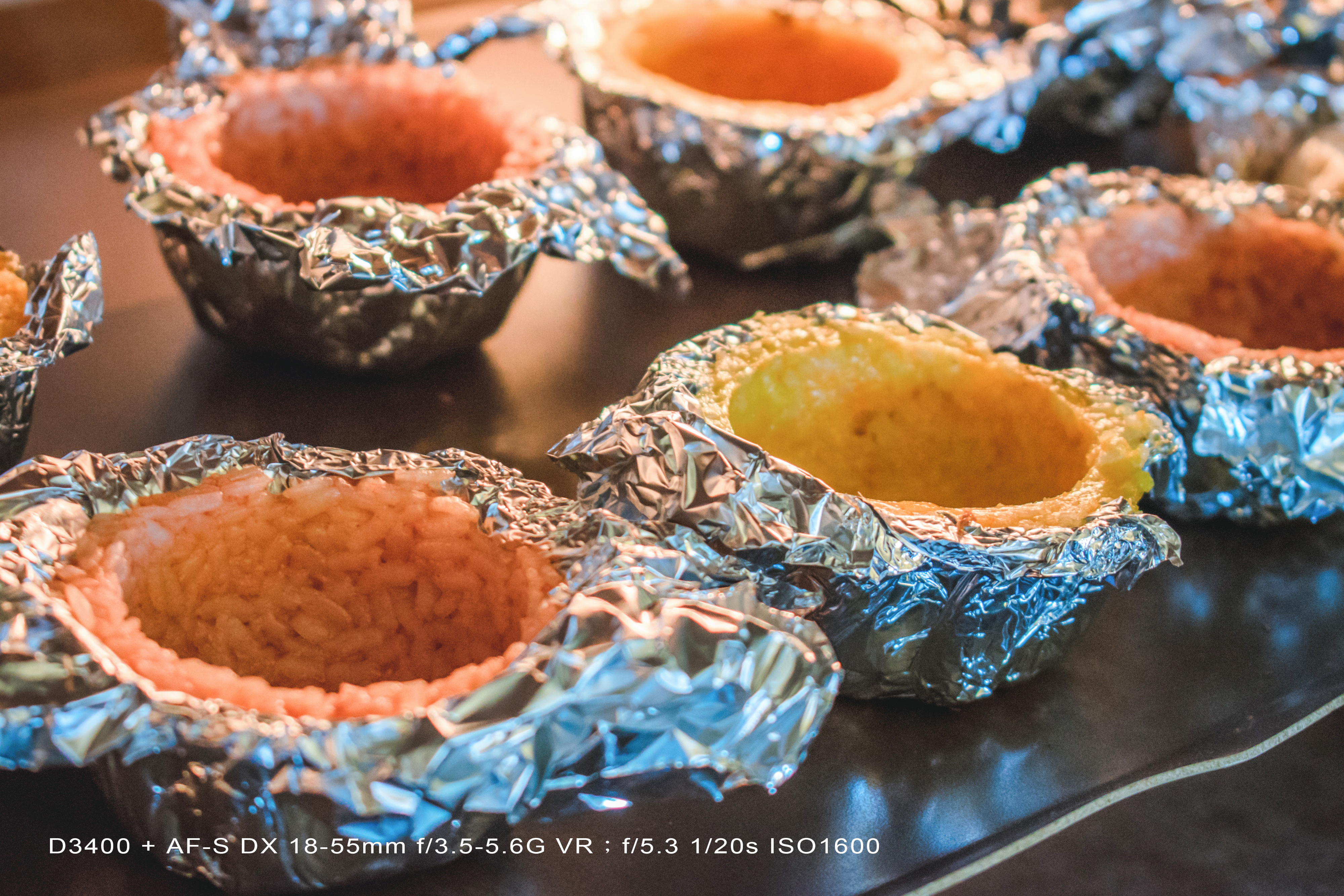 小孩帶出門放風,跑跑跳跳的其實都會很餓,所以也是要有一些比較塞得飽的食物。烤了幾個馬鈴薯飯盅,紅色是番茄醬口味,黃色是加薑黃粉。先放入烤箱把飯烤到稍微「恰恰」(微焦),同時塑型。